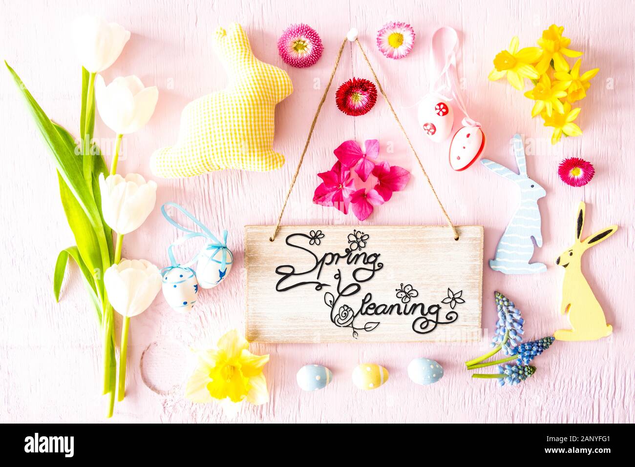 Rustikales Holzschild Mit Englischen Kalligraphie Fruhjahrsputz Sonnige Wohnung Legen Mit Fruhling Blumen Bluten Und Ostern Dekoration Wie Osterhasen Woode Stockfotografie Alamy